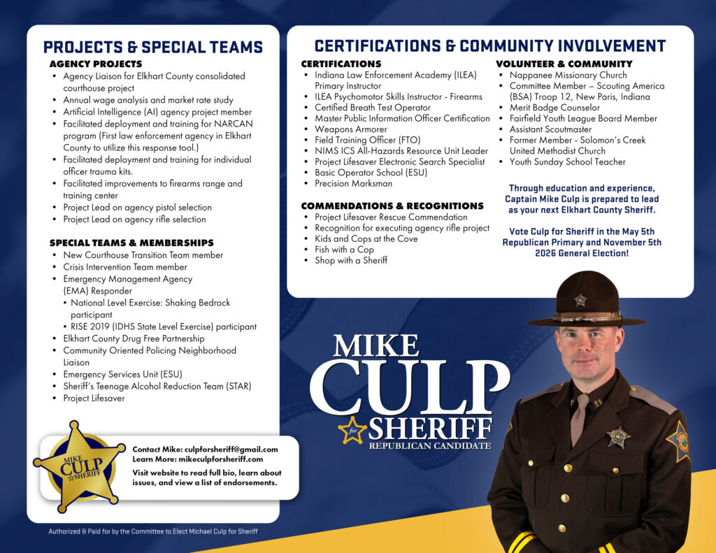 Born and raised just south of New Paris, Indiana, Captain Mike Culp is a lifelong resident of Elkhart County and has dedicated himself to serving our community through the Elkhart County Sheriff’s Office. He seeks the office of elected Sheriff in the 2026 election as a Republican Candidate.